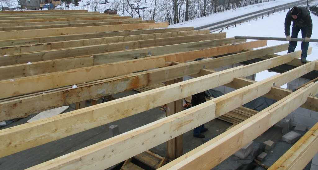 Сначала на верхнем обвязочном поясе посредством специальных блочных башмаков крепятся балки перекрытий, для изготовления которых берутся 40 миллиметровые доски.