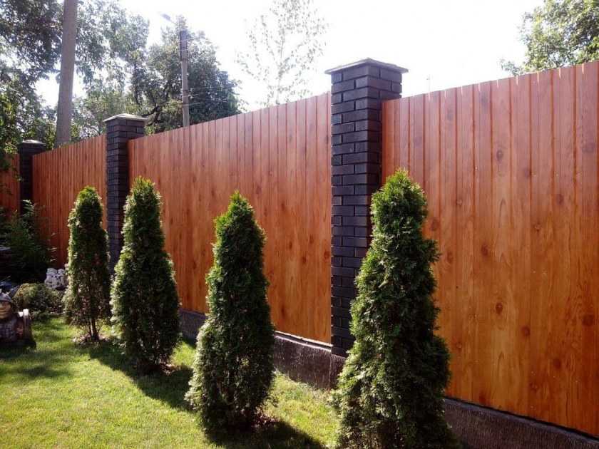 - Допустимое минимальное расстояние до строений по правилам противопожарной безопасности зависит от материала ограждения: камень, бетон — 6 м; камень + дерево — 8 м; дерево — 15 м.