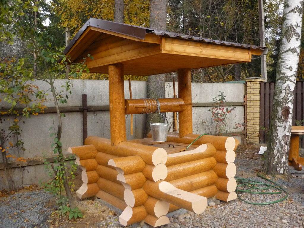 Чаще всего колодец обшивают камнем и кирпичом, но наиболее популярный вид оформления — это дерево. Подобная отделка идеально подойдет для домов из бруса или сруба. В этом случае сооружается колодезный домик, который не только защищает воду от мусора, но и служит мощным декоративным элементом. Хорошо подобное сооружение впишется в экстерьер домов в стиле: рустик, кантри, норвежский, финский, фермерский, русский стиль.
