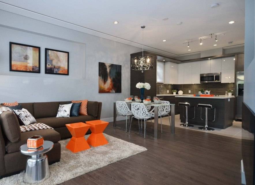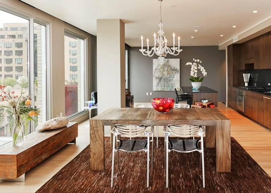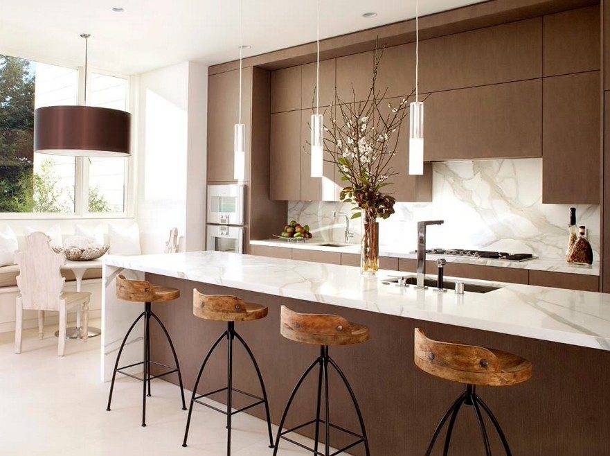 Разобравшись в материалах, осталось только правильно их сочетать — с учетом того, что любая кухня обычно делиться на две зоны, рабочую и обеденную. Материал для рабочей зоны должен быть максимально стойким, материал для обеденной попроще.