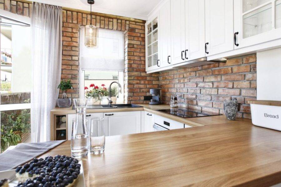 Имитация кирпичной кладки в рабочей зоне кухни – удачный вариант зонирования просторного помещения с преобладающим светлым дизайном. Кухня в таком варианте будет стильной, вместе с тем оформленной функционально и просто.