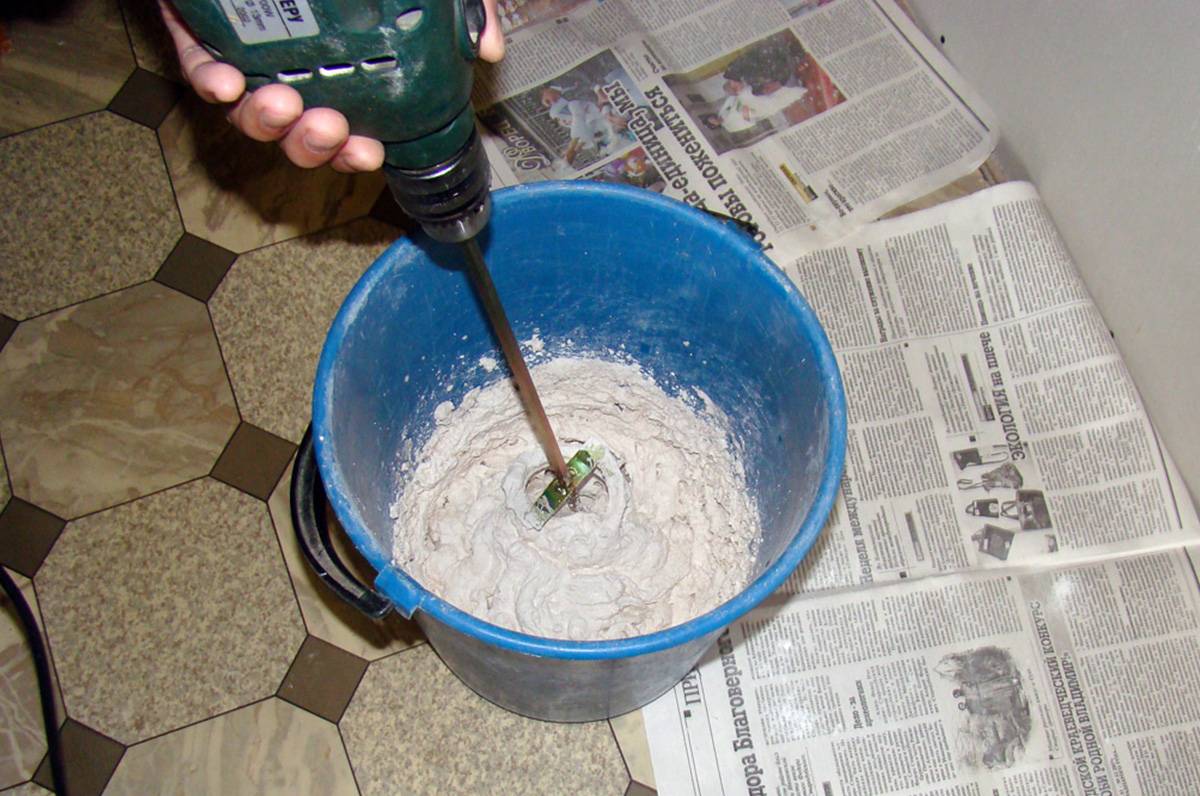 Раствор замесить в домашних условиях легко. Сначала промывается емкость, где будет готовиться смесь, и в нее наливается вода. Количество используемой жидкости должно соответствовать указанному на упаковочной таре. Постепенно насыпается сухой порошок и начинается замес дрелью-миксером.