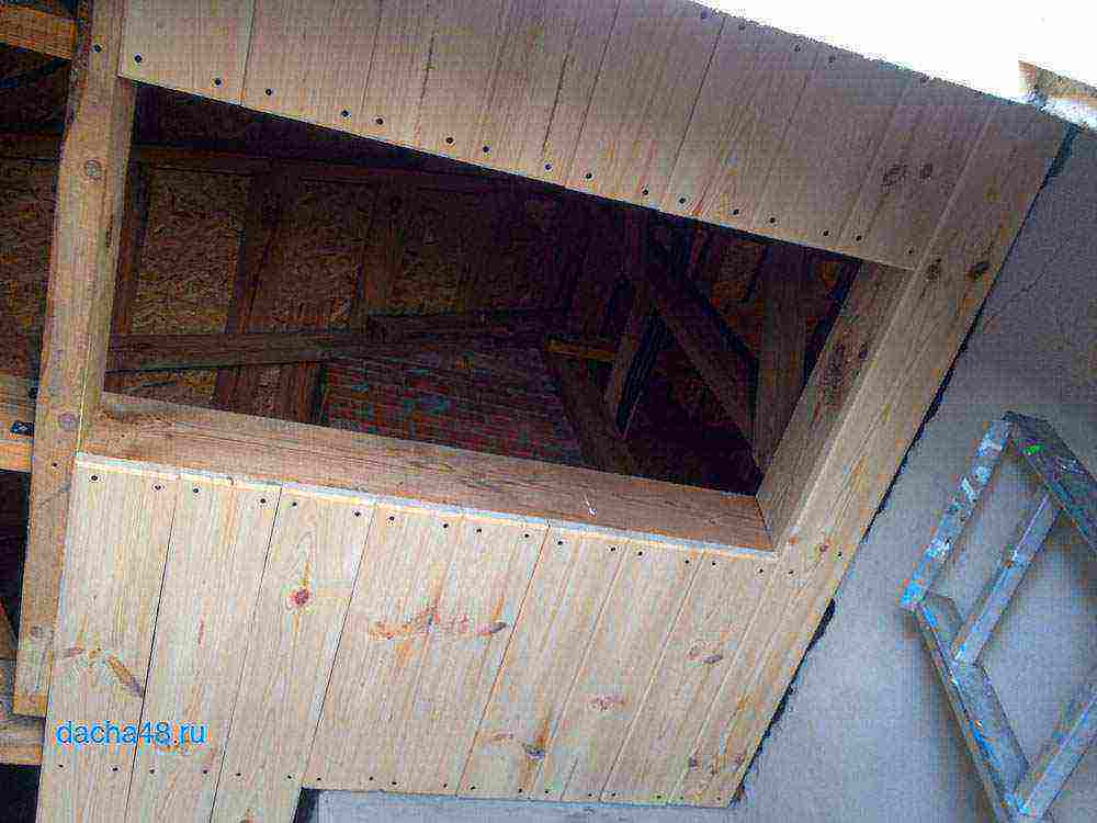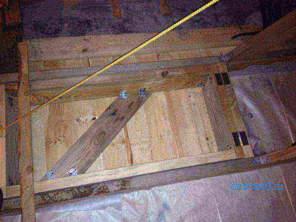 - Если дом деревянный, то прорезать люк на чердак и утеплять его можно прямо в древесине чердачного перекрытия, используя его как коробку.