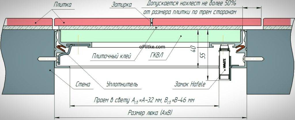 - Крышка люка – эта деталь должна быть очень прочной, так как именно она будет нести все нагрузки. В ее основе находится крепкая рама, поверх которой устанавливается основной материал (металл, дерево, фанера, ОСП и прочее). В магазинных люках каркасы обшивают гипсоволоконными листами, которые и прочность неплохую имеют, и адгезию к цементным растворам и клеям, что облегчает процесс отделки.