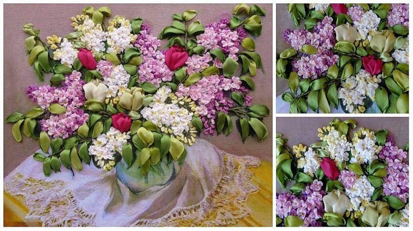 Картины создают из бисера и атласных лент, пришивая все это к канве или любой другой ткани.