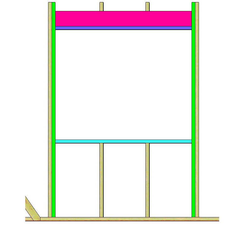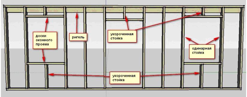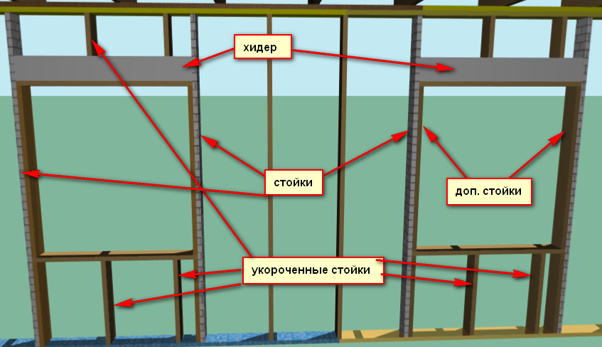 Под хидером и под окнам располагаются горизонтальные доски проема, которые обычно разрезают дополнительную стойку (доп. стойку) на 2 части (на картинке ниже). Верхняя нужна, если хидер сбит из двух досок с промежутком посередине (там обычно закладывают пенопласт: например 50 мм дерева + 50 мм пенопласта + 50 мм дерева), чтобы к ней можно было нормально крепить окно.