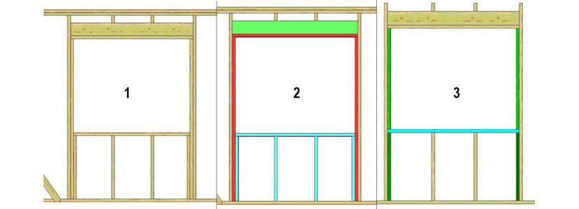 Канадская. Данная технология заключается в применении сдвоенных стоек. Сверху и снизу проема монтируются укороченные стойки – шаг такой же, как и у основных стоек каркаса. Сверху проема ставится хидер, чтобы укрепить оконный проем – расстояние между основными стойками получается слишком большим, и распределение нагрузки только на стойки может быть рискованным. Размер хидера считают, исходя из ширины оконного проема и нагрузок (существуют примерные таблицы хидеров). Следует отметить, что сдвоенные стойки являются дополнительными мостиками холода, в связи с чем в суровом климате финскую технологию оформления оконных проемов предпочитают канадской.