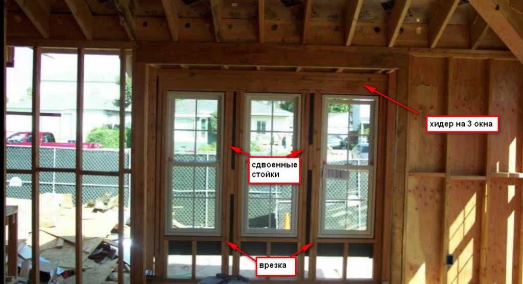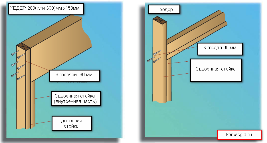 Если стена без проемов, то вся нагрузка равномерно идет на нижнюю обвязку и дальше в фундамент. При наличии окон появляется большое расстояние между стойками. В данном случае устанавливают хидер над проемом. В высоту он имеет 100-130 см и состоит из сдвоенной или строенной доски. Высота подбирается по размеру окна и в зависимости от нагрузок лаг перекрытия. Хидер также вбирает в себя нагрузку и равномерно её распределяет.