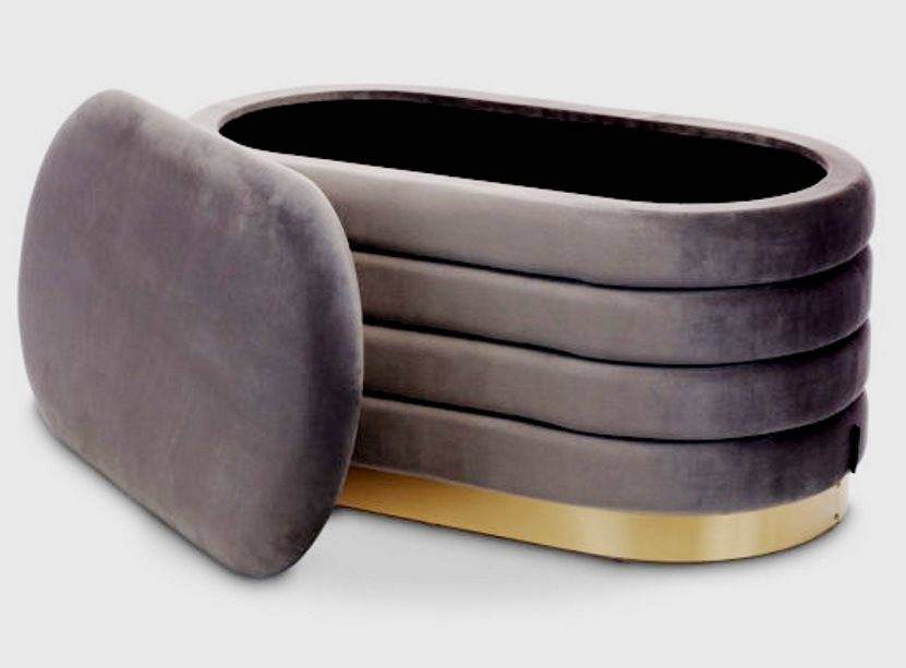 Эта новинка пользуется повышенным спросом среди отечественных потребителей. Конструкция овальной формы оснащена открывающейся крышкой, которая открывает взору некоторое пространство, предназначенное для хранения вещей. В качестве внешней отделки применяется велюровое полотно. Расцветка нейтральная, серая. В качестве декоративного элемента выступает металлический ободок золотистого цвета, который опоясывает нижнюю часть конструкции.