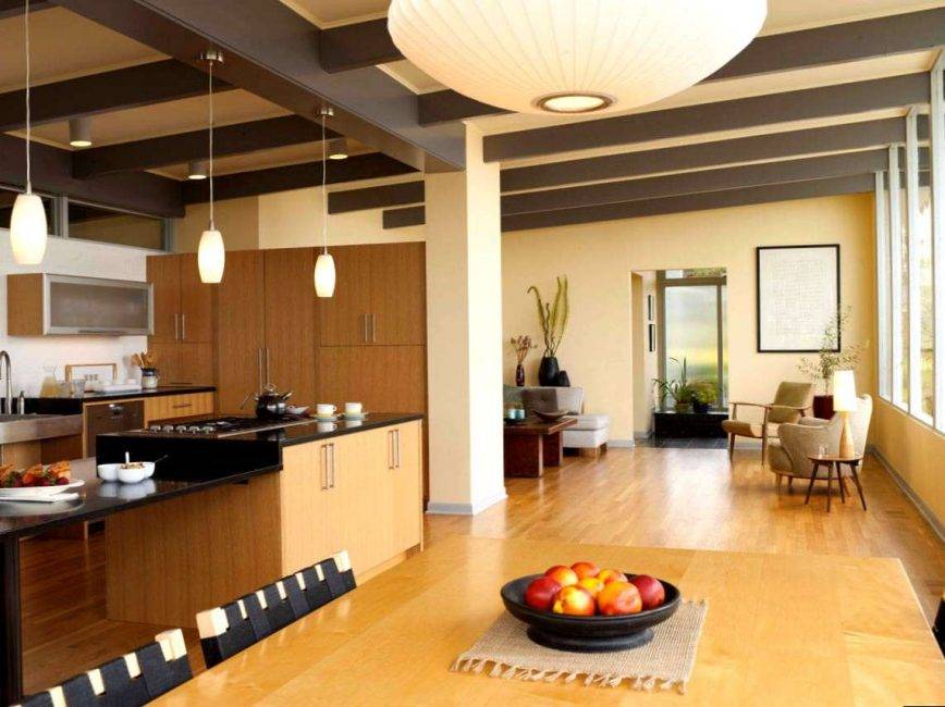 - если у вас нет желания создавать резкие переходы между зонами кухни и гостиной – организуйте небольшую столовую между ними. Обеденный стол станет эффектным дополнением к каждому из интерьеров;