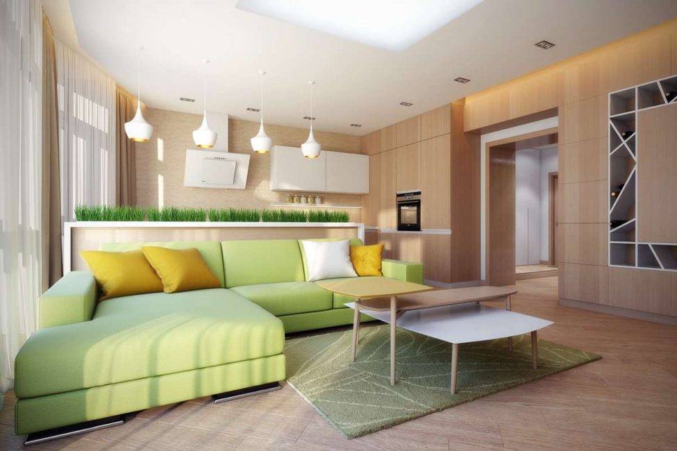 Совет: попробуйте визуально разделить зону гостиной и кухни. В этом вам помогут современные перегородки из пластика, стекла, дерева, гипсокартона и других материалов.