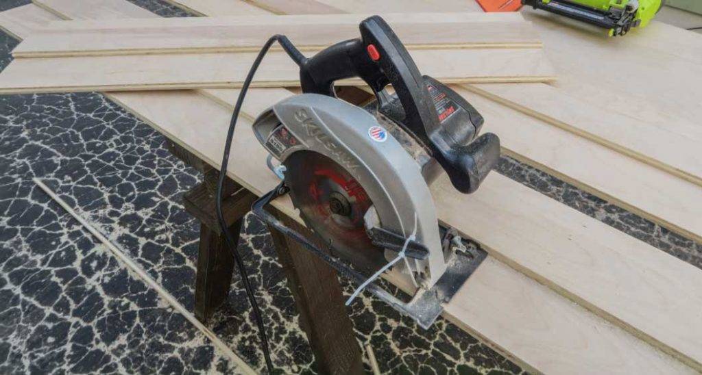 Для самого простого варианта конструкции стола берут лист фанеры вырезают прямоугольник, на котором делают длинный пропил. По нему будет двигаться торцовка. Сверху на ширину рабочей плоскости самой циркулярной пилы прикручивают 2 направляющие. Они могут быть из алюминиевого уголка. К фанерному листу снизу прикручивают 2 подставки. Их высота должна равняться глубине пропила имеющейся модели пилы. По этой получившейся направляющей будет ходить инструмент. От того как будет закреплена направляющая, можно будет делать точный распил под любым углом. Простой стол готов.