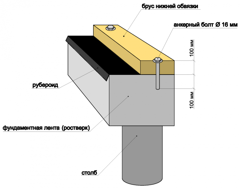 - Выполняются работы по подготовке основания и фиксации опорного бруса по периметру дома. Соответствующие анкеры или штыри закладываются в верхней части или армопоясе еще на этапе их заложения, между древесиной и другими материалами всегда размещается как минимум 2 слоя гидроизоляции.