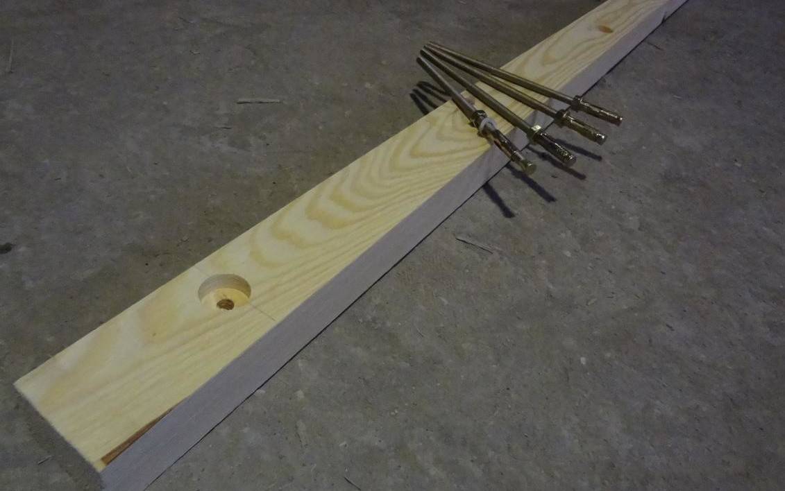 Крепление мауэрлата на анкерные болты выполняют прямо в армопояс перед заливкой. Чтобы произвести разметку отверстий под анкерные болты, нужно подготовить доску и разметить на ней места установки. Далее доску прикладывают к грани мауэрлата и согласно разметке высверливают отверстия. Мауэрлат после подготовки надевают на болты, подкладывают шайбу, затем закручивают гайку.