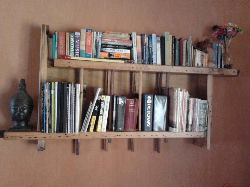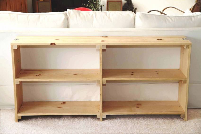 Любителям натуральных подручных материалов вполне можно выбрать иное решение — изготовить стеллаж из мебельного щита. Заготовки пропитывают морилкой, покрывают лаком. Мебельные щиты настолько же привлекательны, как и натуральная древесина (массив). Односторонняя ориентация волокон в цельном материале позволяет исключить разрастание микроскопических трещин. Именно эта проблема сильно сказывается при использовании традиционного натурального дерева.