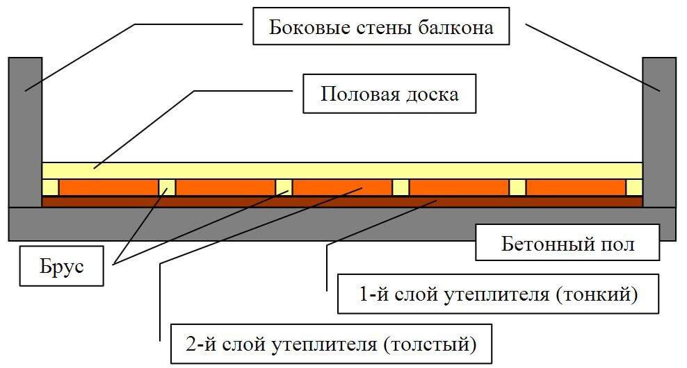 Брусья укладываются на расстоянии, равном ширине одного листа утеплителя. Что же касается высоты балок, то она, как правило, составляет 10-15 см. для предотвращения щелей, которые появляются между лагами и стеной балкона используется обыкновенная монтажная пена.