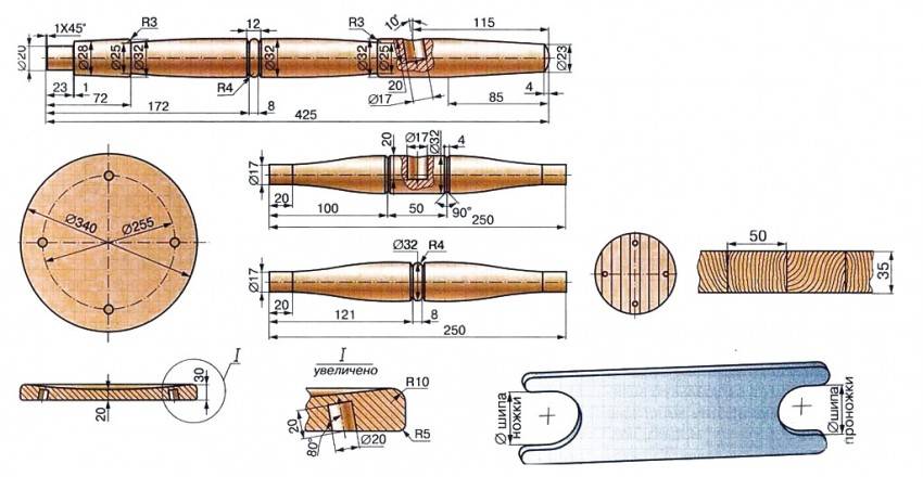 Для царги и распорок применяют брус с соответствующими размерами 290х60х20 мм и 290х20х20 мм. Сиденье проще изготовить из доски толщиной 60–80 мм и размерами сторон 350х350 мм.