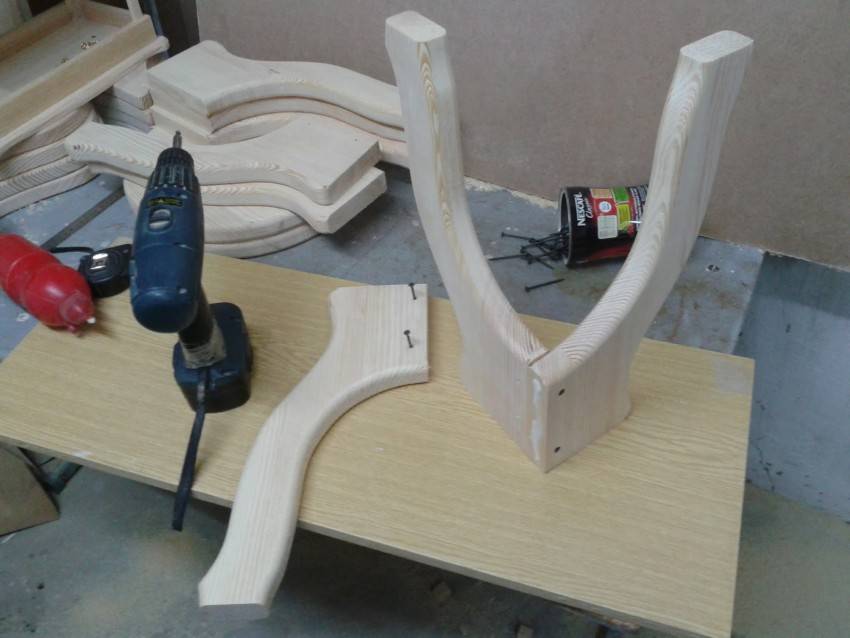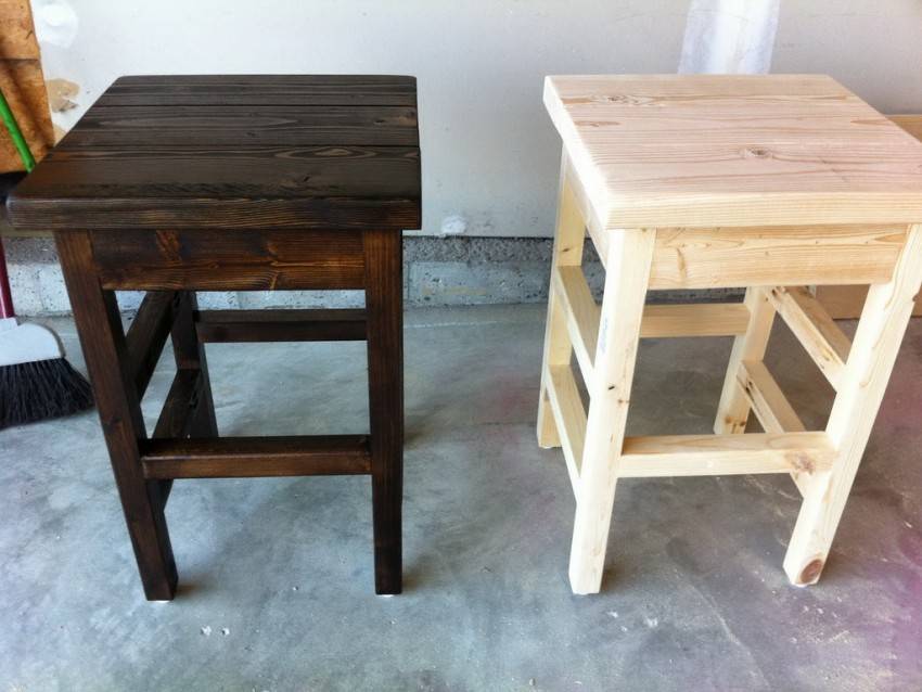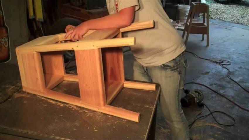 Изготавливая табуреты своими руками из выбранной породы дерева, следует смазать клеем и соединить между собой все области крепления ножек стула и перекладин и подождать до полного высыхания, после чего зафиксировать соединения с помощью саморезов.