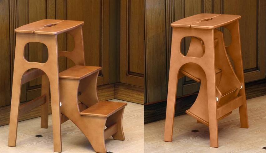 | Табурет-стремянка | Еще одна разновидность табуретов, которые можно изготовить самостоятельно. Изделие складывается и применяется в качестве стремянки. Табурет-стремянка может использоваться не только в частных домах, но и в обычных квартирах, например, во время ремонта или для прикручивания лампочки. |