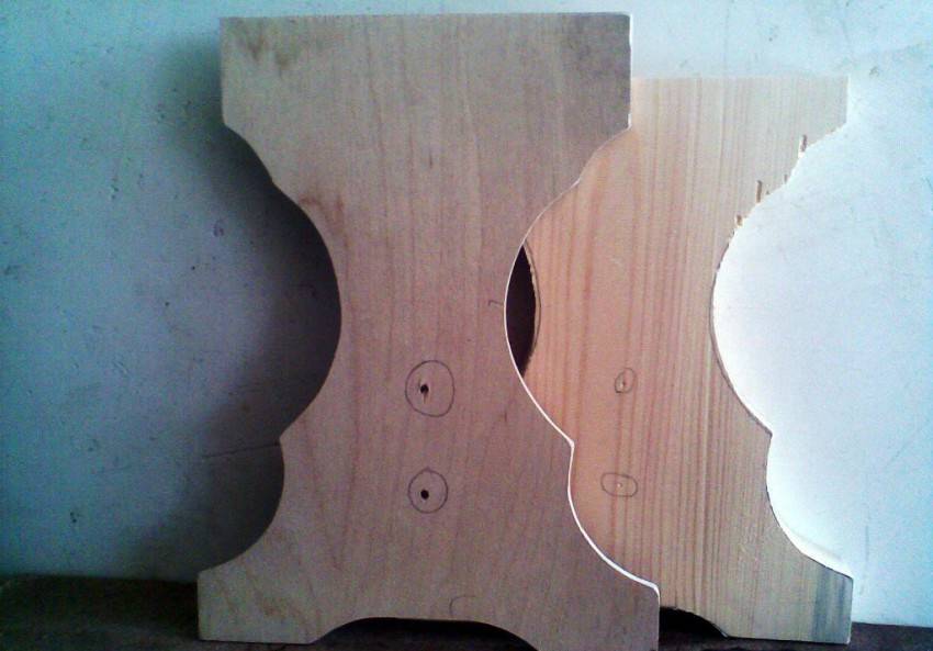 Из досок изготавливаем перекладины длиной 44 см, на которых вырезаем шипы размерами на 1 мм меньше, чем пазы. Если Вы решили изготовить резные ножки для стула, тогда метод их крепления будет немного отличаться от предлагаемого нами варианта. Сиденье табуретки, как правило, делают из листа толстой фанеры или доски и вырезают по заранее просчитанным размерам.