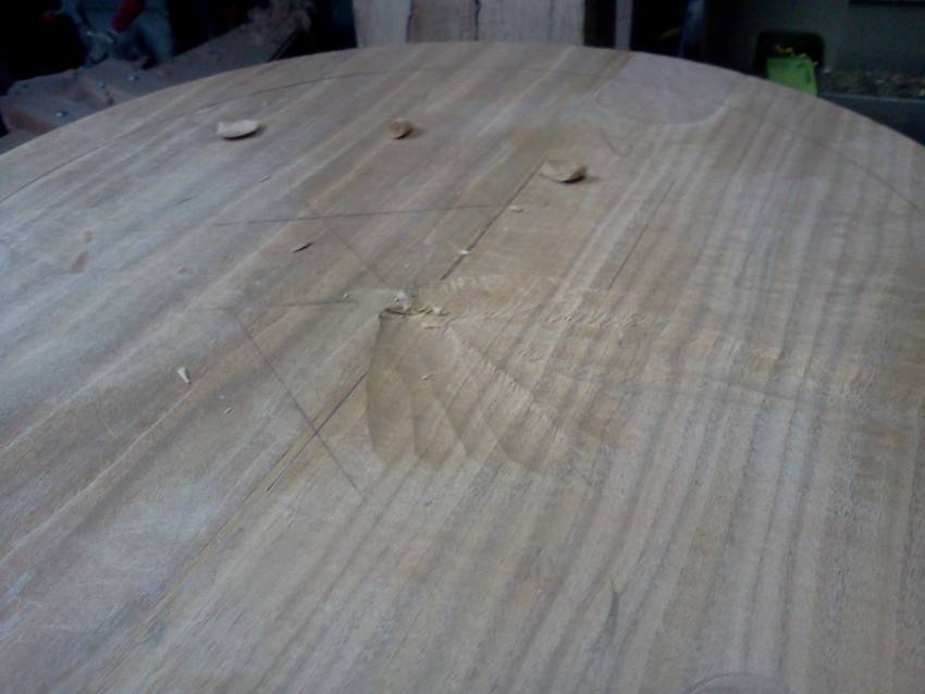 Другое дело, если захват приходится на стык досок; чаще всего так бывает в классических кухонных табуретах, см. далее. Тут уж клюв пера или пионерное сверло/направляющий штырь коронки при работе ручной дрелью обязательно уйдут по пазу и сверло поведет вправо. Кондуктор из толстой фанеры или обрезка доски не помогает, тонкая боковина пера или зубья коронки его рвут, а о стальной кондуктор цепляются сами.