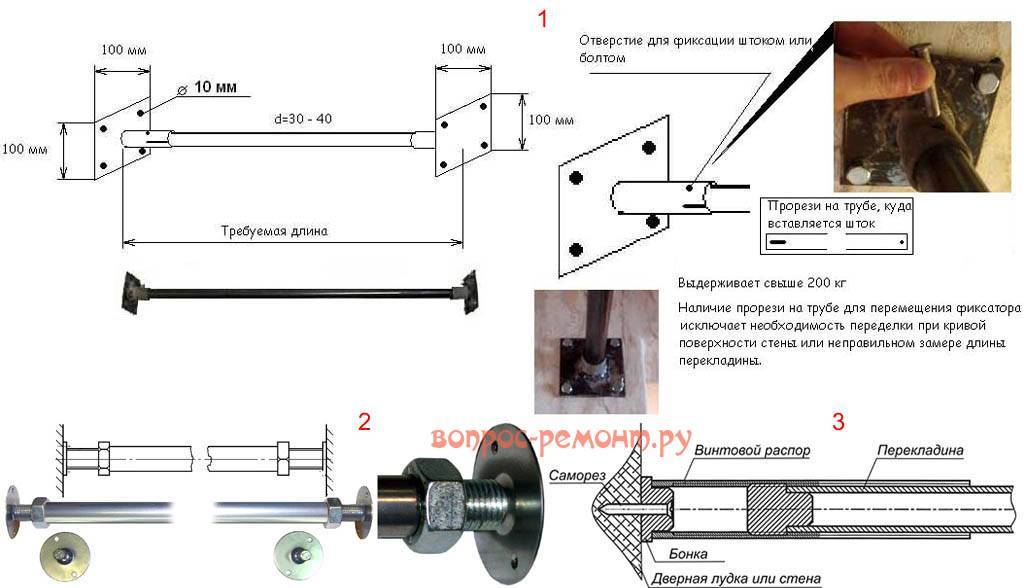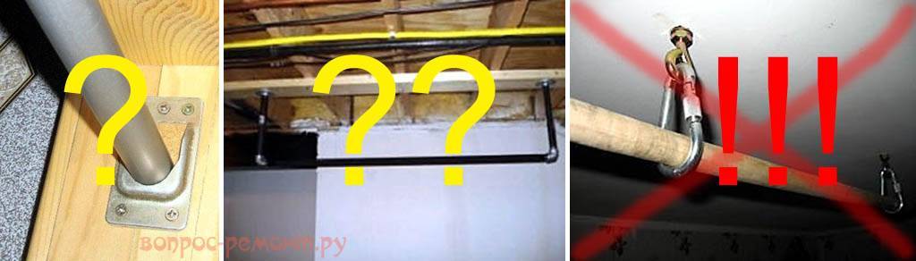 Полезнее и уж точно надежнее будет самодельный турник, устанавливаемый в дверной проем или коридор в распор или на боковых держателях. Тут есть определенные тонкости. Во-первых, съемная перекладина (гриф), вкладываемая в U-образные карманы (слева на рис.) неизбежно даст люфт. Заниматься, когда планка ходит в руках, неудобно и не весьма полезно, но, что хуже – резкие мгновенные нагрузки передаются строительным конструкциям. Которые на них ну никак не рассчитаны. Жесткое крепление к потолку (в центре) немногим лучше; человек-атлет – не люстра. И уж совсем недопустимо мягкое крепление с сосредоточением нагрузок, справа.