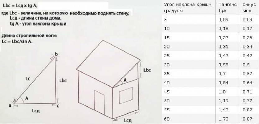 Чтобы обеспечить найденный угол уклона односкатной кровли, необходимо одну из стен поднять выше. Насколько выше узнаем, вспомнив формулы расчета прямоугольного треугольника. По ним находим и длину стропильных ног.