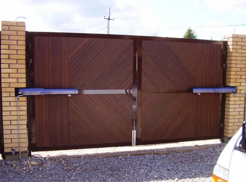 А вот что касается крепления створок к стойкам, то здесь применяются специальные петли для деревянных ворот. Они представлены в большом ассортименте в строительных магазинах, многие умельцы изготавливают их своими руками. Так что последние можно приобрести на строительном рынке, они дешевле, а по прочности не уступят заводским.