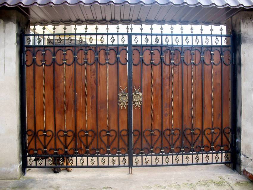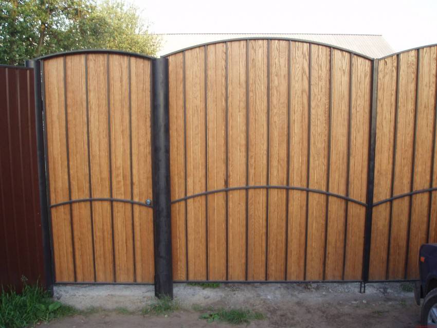 Что касается последней, то чаще всего доски устанавливаются по вертикали. Их верхние торцы можно сделать прямыми, скругленными или придать любую другую формы для повышения декоративности деревянных ворот. Крепление – саморезы или болты.