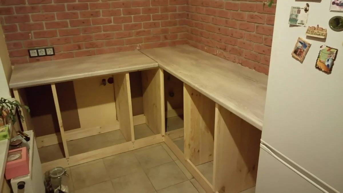 Теперь можно устанавливать нижние тумбы на свое место к стене. Естественно, что дверцы навешивать пока не нужно. Шкафы на полу регулируются по высоте. Если есть необходимость, то в мебели делаются пропилы.