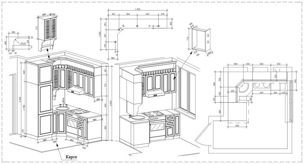 - Составляется предварительный эскиз самодельного кухонного гарнитура. Подбирается оптимальная высота столешницы, высота открытых полок, либо подвесных шкафчиков.