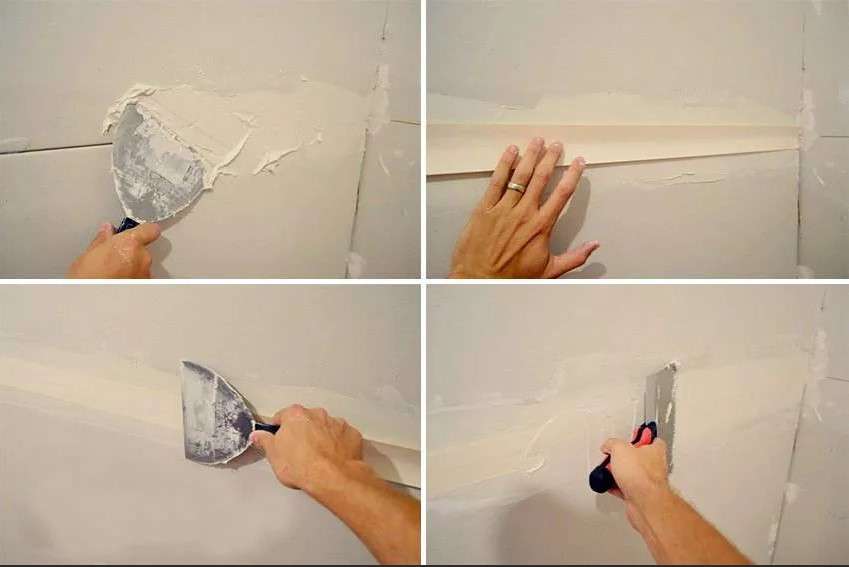 - Бумажную ленту предварительно намочить в воде для лучшего сцепления с поверхностью и предотвращения образования пузырей. Заполнить шов шпаклевкой и вклеить ленту, слегка прижимая ее узким шпателем. Лента должны быть полностью погружена в раствор.