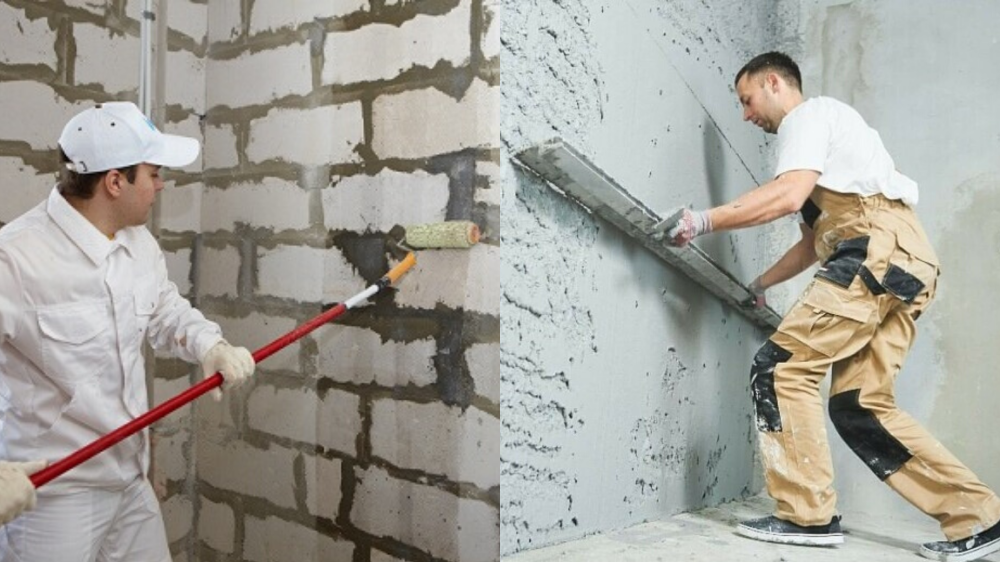 Рис. 3. Нанесение грунтовки на газобетон и выравнивание штукатурки