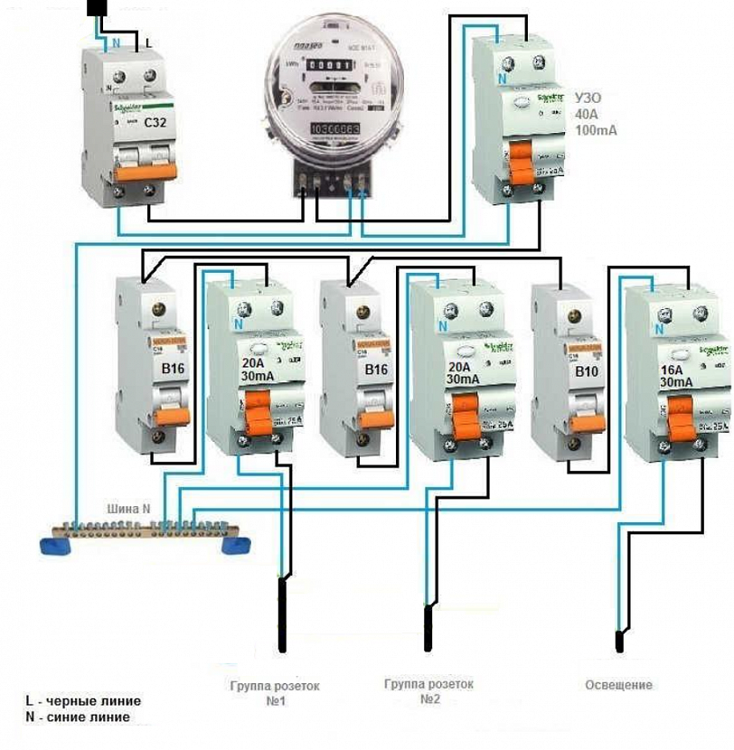 Также в щитке устанавливаются две шины: заземления и зануления. На шину заземления заводятся все заземляющие провода от приборов и устройств. На «нулевую» шину провод приходит от УЗО, и подается на соответствующие входы автоматов. Обозначается ноль обычно буквой N, при разводке принято использовать синий провод. Для заземления — белый или желто-зеленый, фазу ведут красным или коричневым проводом.
