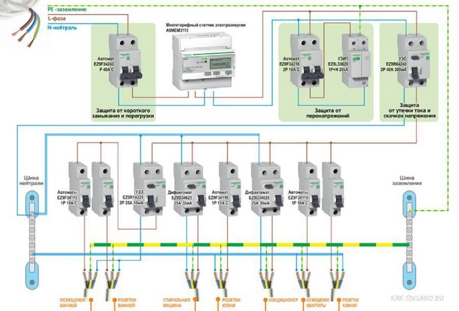 Не всегда схемы электропитания просты: групп потребителей разбивают по этажам, отдельно выводят хозпостройки, освещение гаража, подвала, двора и придомовой территории. При большом количестве потребителей кроме общего УЗО после счетчика, ставят такие же устройства, только меньшей мощности — на каждую группу. Отдельно, с обязательной установкой персонального защитного устройства, выводят электропитание для ванной комнаты: это одно из самых опасных помещений в доме и квартире.
