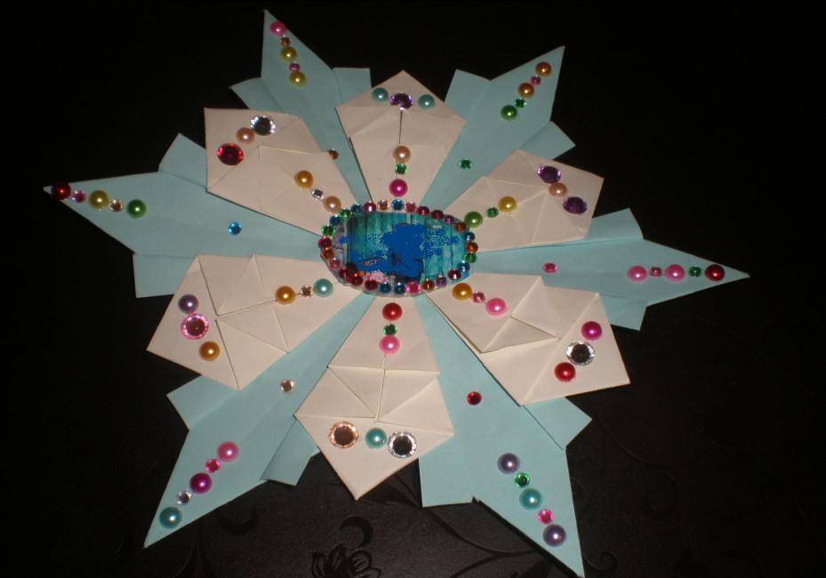 Но все же самым распространенным видом остаются снежинки, вы умеете их правильно вырезать, а делать их, используя технику оригами, смотрите какую мы с сыном сделали на днях: