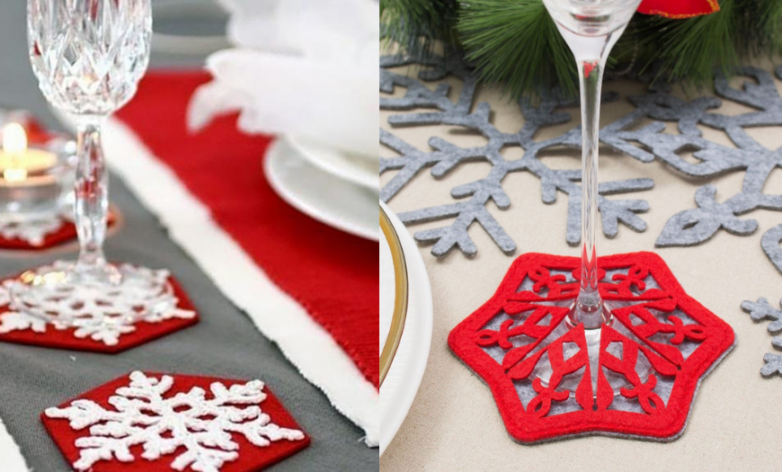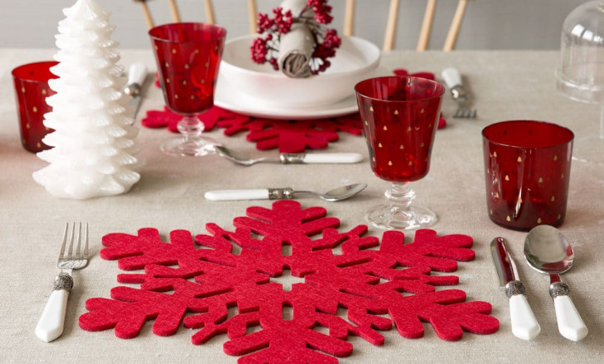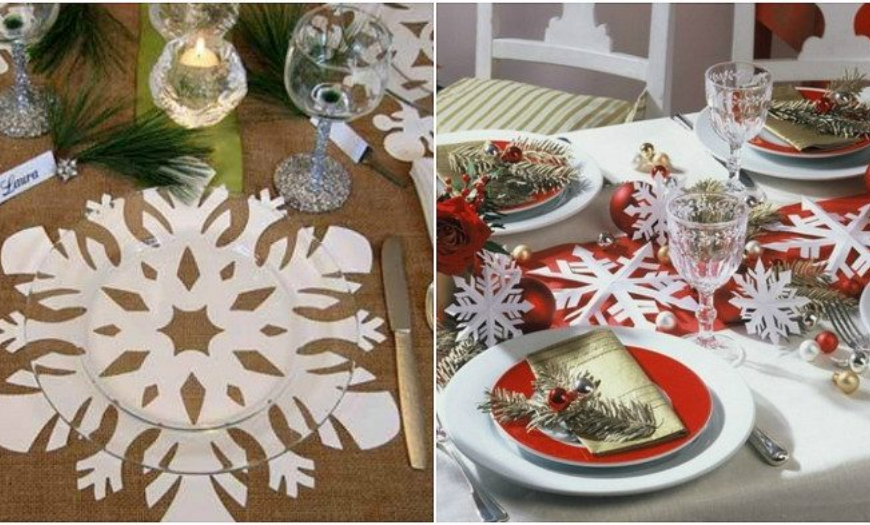 Праздничная трапеза – апофеоз торжества. Но кроме основных задач – потребление вкусных угощений и веселого общения – стол тоже должен дарить новогоднее настроение. Поэтому рекомендуется выделить на нем праздничный уголок, установив поднос, который застелить большой бумажной снежинкой. Туда можно выставить детские поделки к этому дню, небольшие подарки, призы-сувениры для награждения победителей конкурсов.