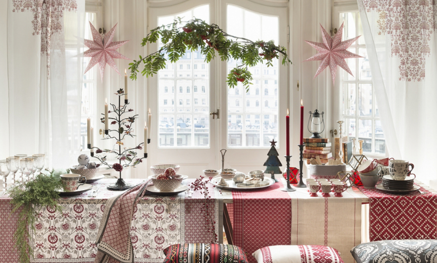 Праздничный декор может быть везде: красиво смотрятся диванные подушки в новогодней стилистике, аналогичный материал используют для украшения стульев и скатерти к рождественскому столу. На шторах или за тюлем можно закрепить всевозможные сетки с интересным мерцанием огоньков, режим которых устанавливается пультом.