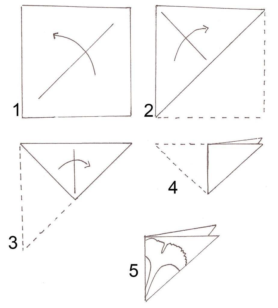 Вот вам несколько готовых узоров, главное правильно сложите лист бумаги, помните как это делается? Напоминаю, возьмите лист квадратной формы и сложит его напополам, затем еще раз и еще раз, а затем нанесите рисунок: