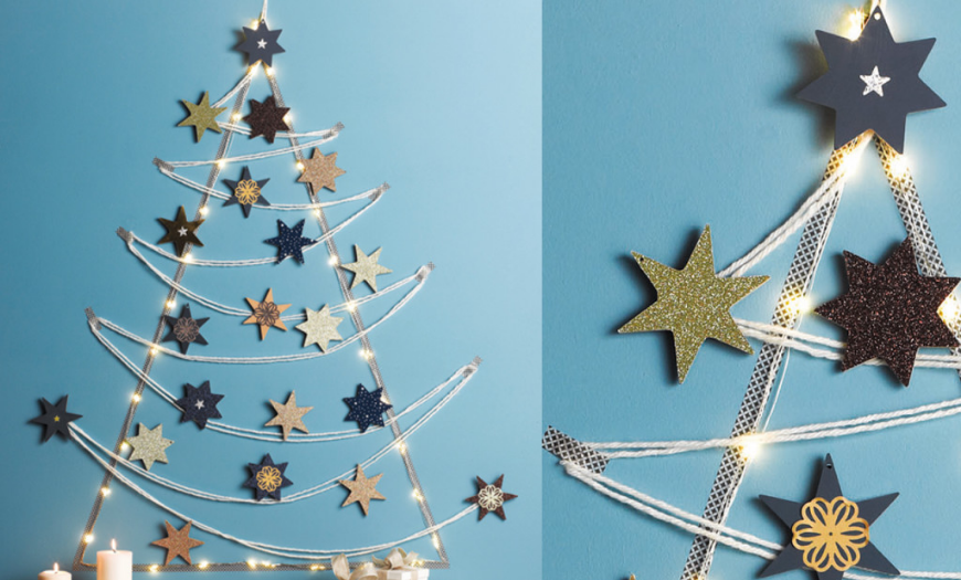 Интересную самодельную елку можно сделать из книг, выложенных затейливой фигурой. Или создать на стене из обычной елочной гирлянды огней, предварительно закрепив её маленькими гвоздиками или кнопками.