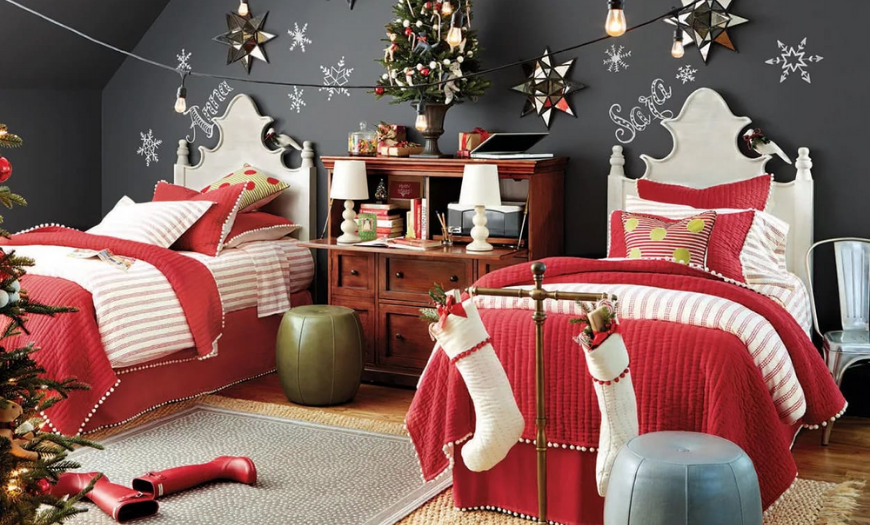 В качестве украшения можно поставить искусственную елку, мягкие поделки из ткани и фетра, а также застелить постельное бельё с новогодними сюжетами.