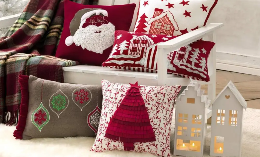 Красиво украсить комнату к Новому году помогут предметы из ткани. Например, диванные подушки, покрывала на кресла, шторы, скатерти украшают временными аппликациями, которые после праздника легко отпороть.