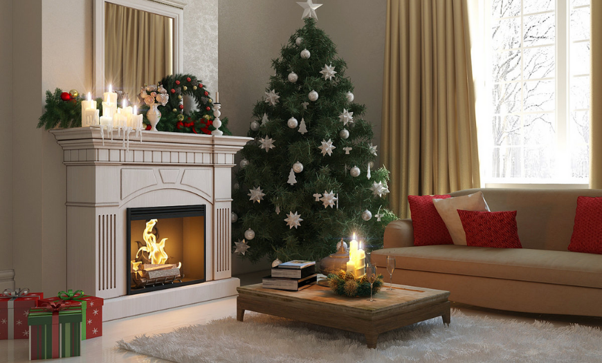 Гостиная – это центр торжества, поэтому к её оформлению необходимо подойти максимально продуманно, здесь не следует перебарщивать с декором. В дополнение к ёлочке размещают рождественскую композицию на камине или над ним, а также украшают гирляндами стены и потолок. Особое настроение придают свечи, которые в новогоднем интерьере должны присутствовать везде.