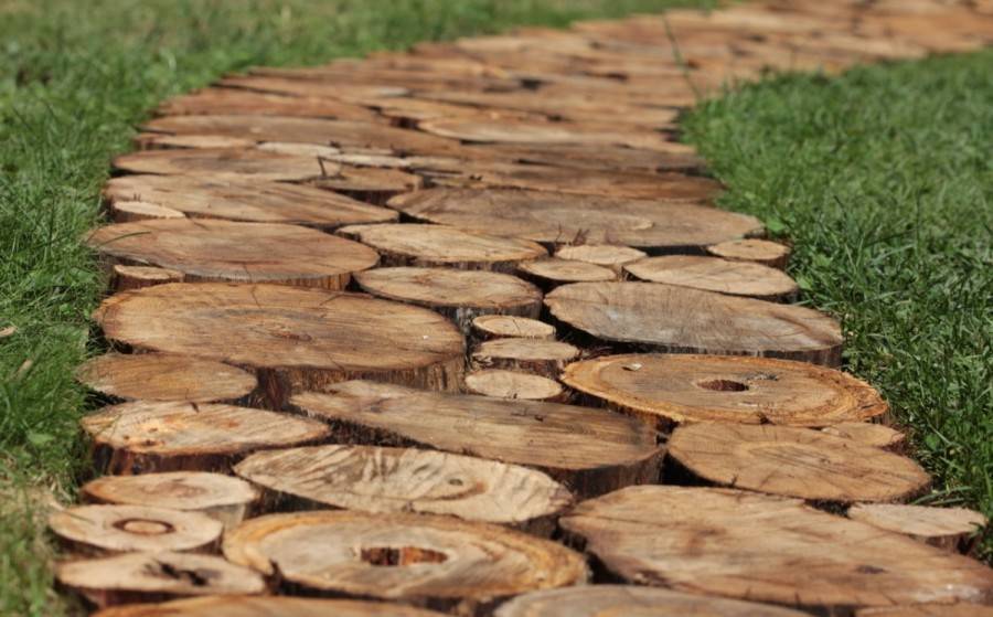 Оригинально будет выглядеть тропа, замощенная распиленными чурочками. Из минусов отметим недолговечность такого покрытия.