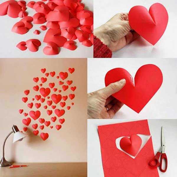 Еще один романтичный вариант — сердечки. Их также вырезают из бумаги, только вырез делают поглубже. Потом соединив и склеив разрезанную часть, придают декору объем. Крепят их точно также — на кусочки двухстороннего скотча.