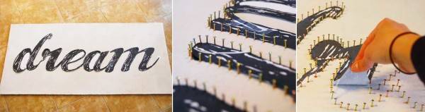 Между гвоздиками натягивают нити, создавая объемный рисунок. Использовать можно любые нитки, к примеру, мулине.
