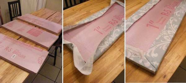 Нарезать пенопласт на равные или разные по размеру полосы, обернуть подходящей тканью или обоями. Закреплять их проще всего скобами из строительного степлера.