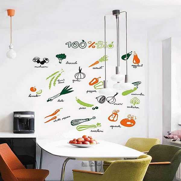 Еще один способ украсить пустую стену на кухне — использовать наклейки. Они могут быть готовые — можно найти в продаже, а можно вырезать их из каких-либо изображений и наклеить на двусторонний скотч.
