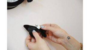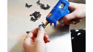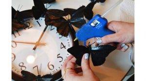 Если речь идет о бабочках, то им надо загнуть «крылышки», оставив прямым тельце. К тельцу приклеить небольшой кусочек двустороннего скотча (пока снять защитное покрытие только с одной стороны). На эту липучку можно будет клеить украшение к любой поверхности.