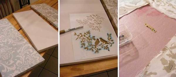 Чтобы панно легко было крепить, к ним крепят (например на клей) скобы. На одном из фрагментов — гладкоокрашенном — можно нанести рисунок. Его можно сделать при помощи трафарета, можно найти какой-то рисунок, вырезать его и приклеить.